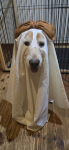 白い布を被って大きなリボンを付けた”お化けきなこ”
