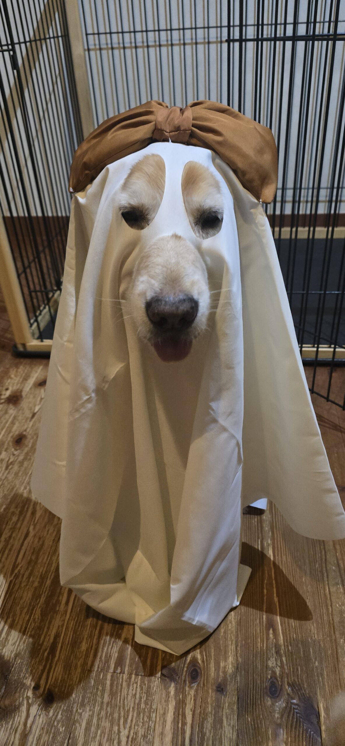 白い布を被って大きなリボンを付けた”お化けきなこ”